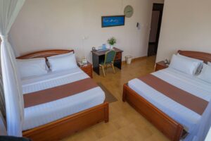 Our Executive Twin Room is tailored for guests traveling together who prefer separate beds without compromising on luxury. Each room features two large single beds with premium bedding, a flat-screen TV, working desk, and a beautifully designed bathroom. Great for colleagues, friends, or families, the room offers privacy, comfort, and full access to resort amenities.